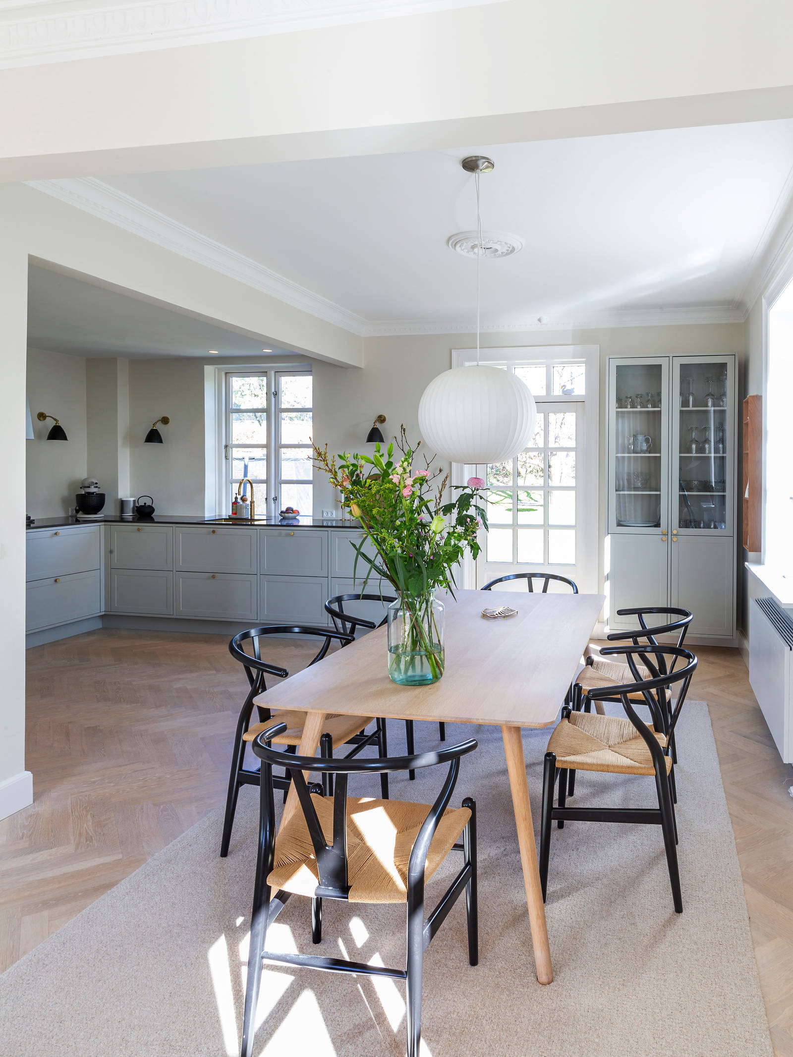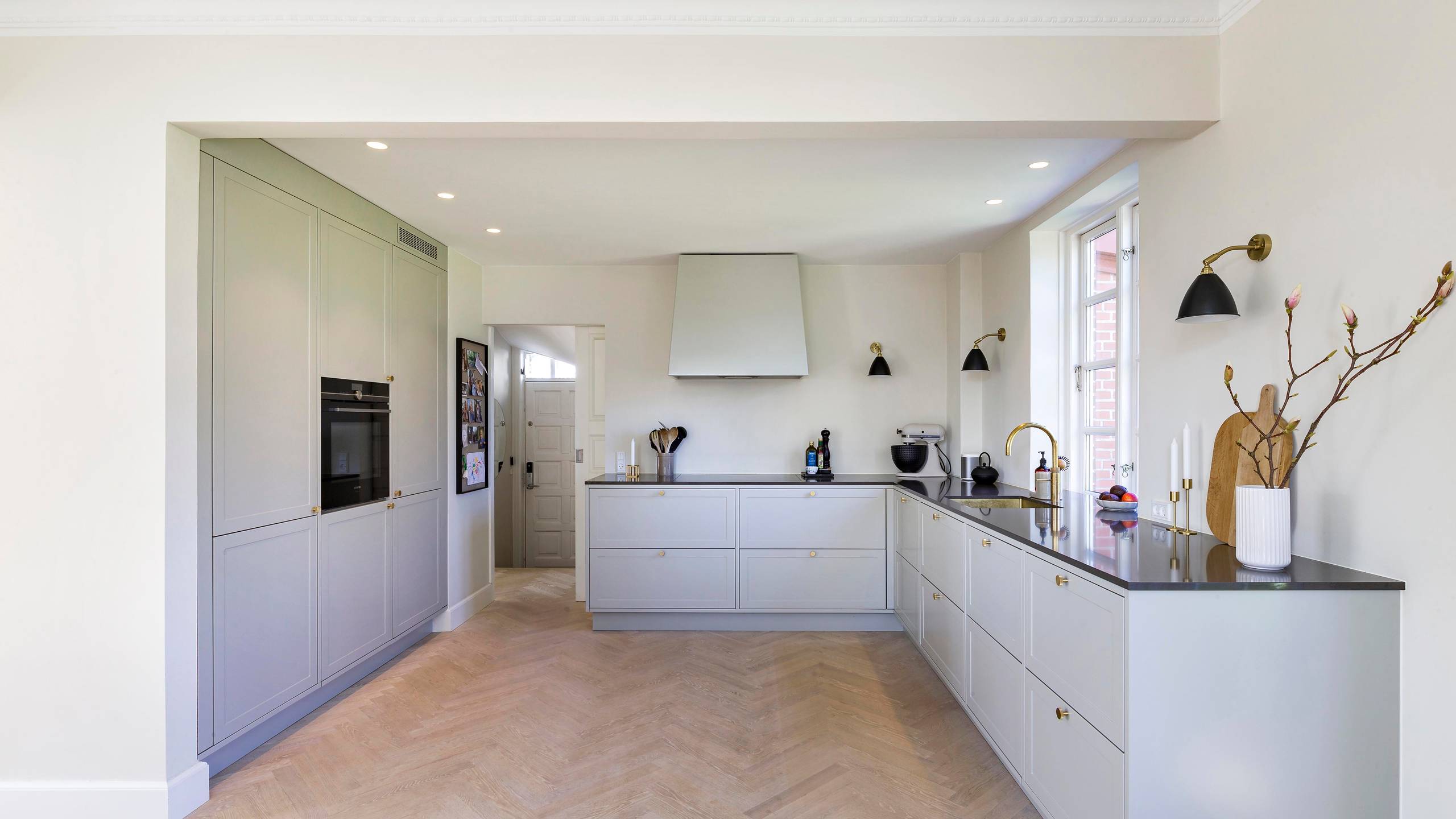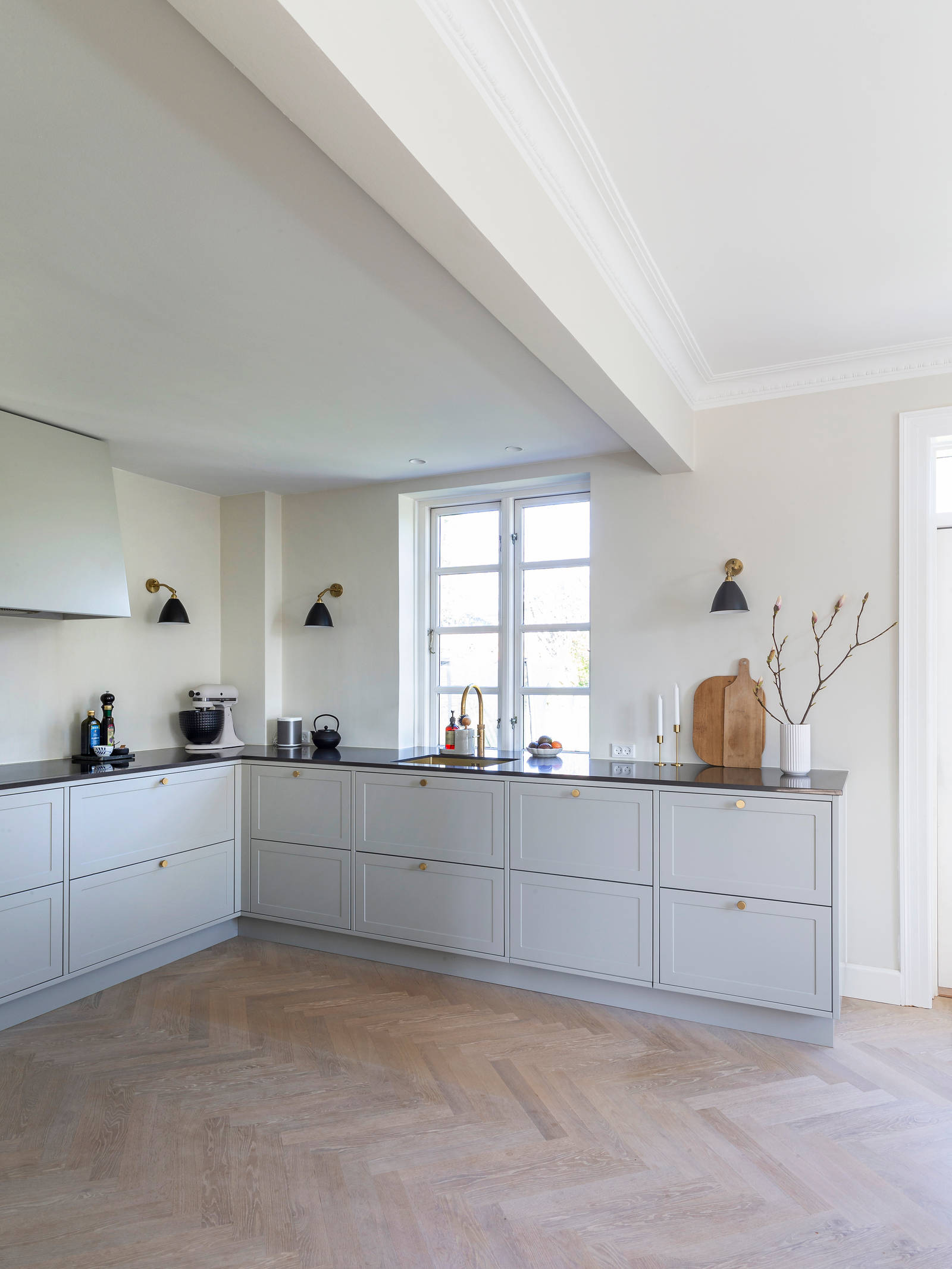 Livet i drømmehuset startede derfor i et stort byggerod, hvor to bærende vægge blev udskiftet med jernbjælker, to forskellige gulve blev erstattet af et nyt smukt sildebensgulv i eg, alt stuk blev genetableret, og det gamle køkken blev udskiftet med et gråt Shaker køkken, der passer til den gamle murermestervilla.