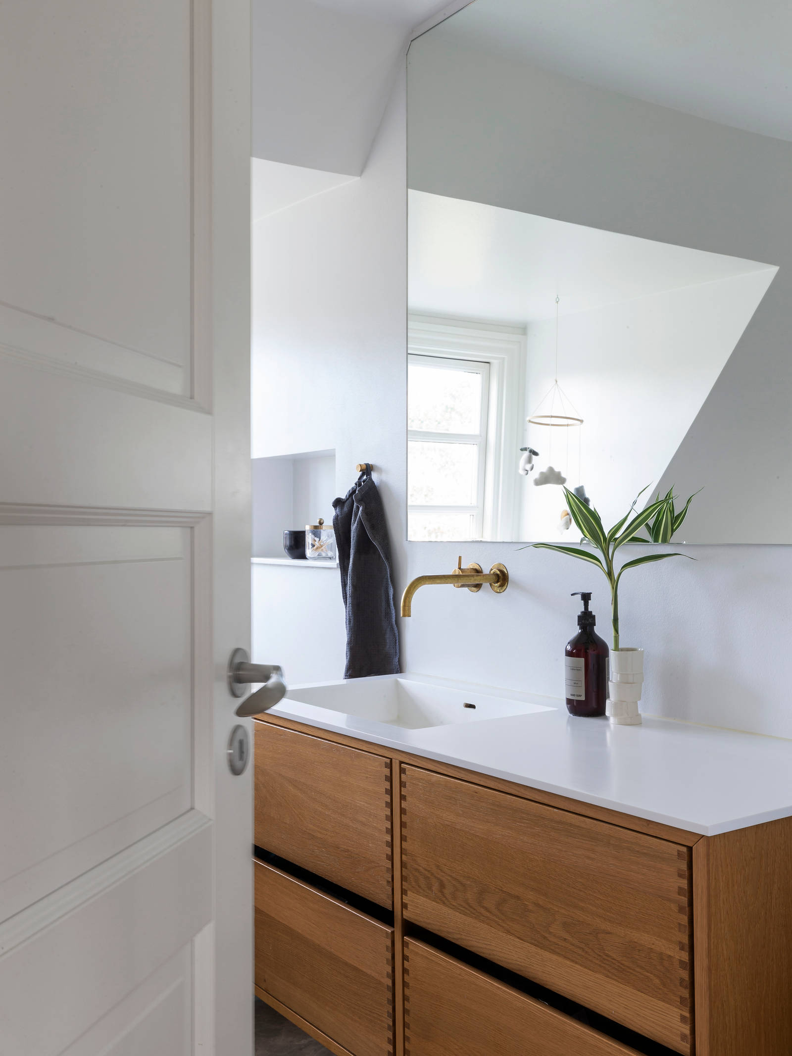 De tidligere ejere havde allerede renoveret hele førstesalen og kælderen, da familien flyttede ind i januar 2022 – og indrettet tre helt nye badeværelser med bl.a. et smukt fritstående badekar og VOLA armaturer i messing, der passede perfekt til huset.