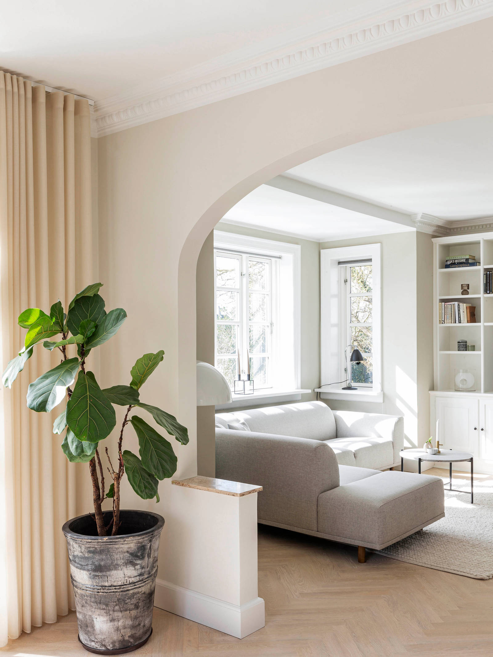 Det var derfor en høj prioritet at finde et hus i området, da familien voksede ud af det første hus. Julie har altid haft en drøm om at bo i en klassisk murermestervilla med originale detaljer som karnap og stuk, og da den smukke murermestervilla fra 1930 blev sat til salg, slog Julie og Peter hurtigt til.